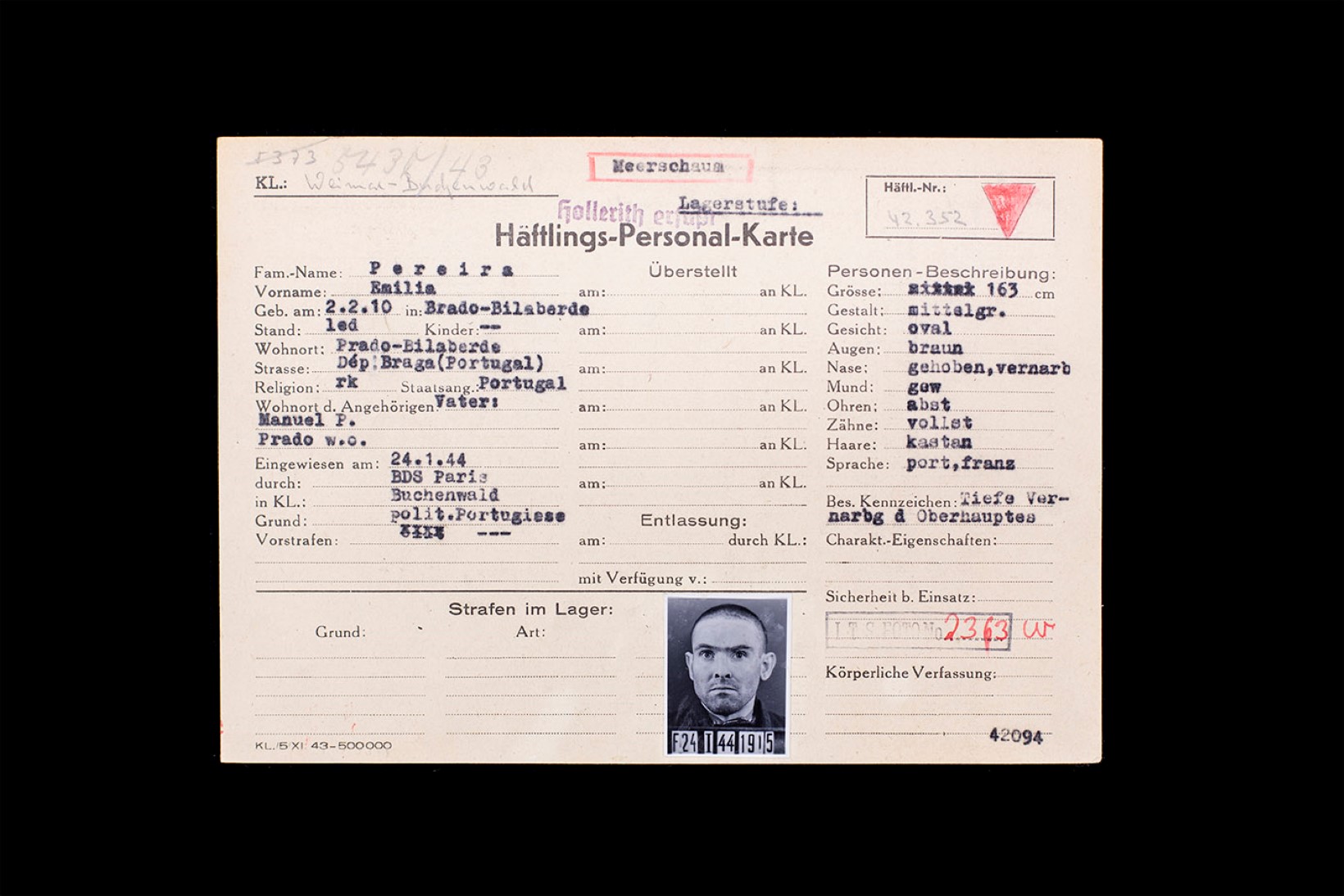 Outro caso estranho é o de Emílio Pereira. O minhoto, natural de Prado, Santa Maria, em Vila Verde, é detido com 33 anos e a sua ficha de prisioneiro é, de todas as que a Revista 2 consultou no ITS, a única que inclui a fotografia do detido. O rosto duro de Emílio ainda nos mira, de frente, tal como era quando chegou a Buchenwald, há 70 anos. Este pedreiro com 1,63 metros, moreno, fora preso a 11 de Dezembro de 1943 e chega ao campo com a indicação de ser um prisioneiro político. O curioso acerca de Emílio é o seu historial médico, que aparentemente o encaminharia directamente para a morte, por ser “dispensável”, e que nos remete para um homem que deveria ser um verdadeiro osso duro de roer.