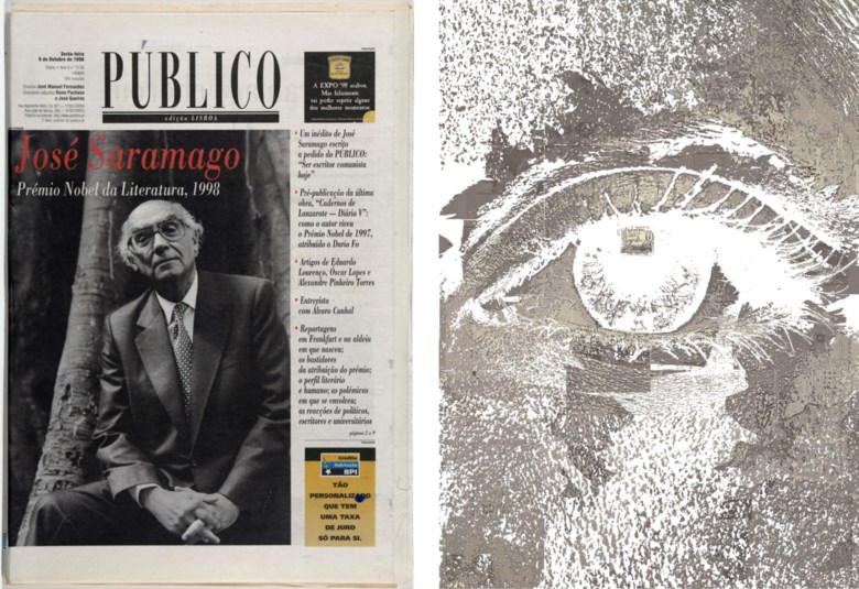 Pela primeira vez, e única até agora, a literatura portuguesa conquistou um Nobel. O prémio a José Saramago ocupou toda a primeira página do dia 9 de Outubro de 1998, a mesma que é agora escolhida pelo artista Alexandre Farto. Ao longo de 25 semanas, Vhils desenvolve com as primeiras páginas do PÚBLICO a peça Olhar, que assinala os 25 anos de aniversário do jornal.