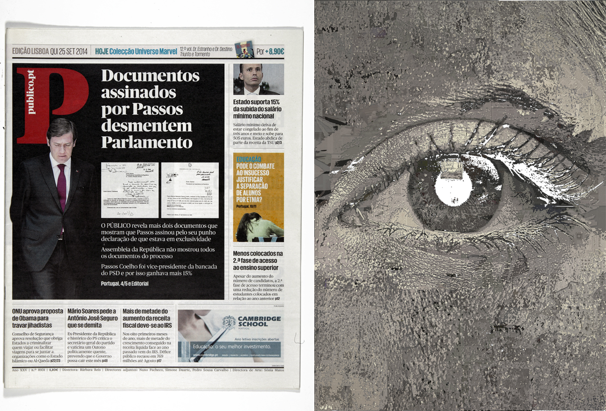 "Afinal qual é a importância de Passos Coelho ter estado ou não em exclusividade na Assembleia da República entre 1995 e 1999? A resposta é simples: se esteve em exclusividade não podia ter recebido qualquer pagamento pelo exercício de actividades profissionais exteriores ao Parlamento. E se não esteve em exclusividade, como disse o secretário-geral do Parlamento, isso quer dizer que recebeu indevidamente cerca de 30 mil euros, correspondentes a parte do subsídio de reintegração que requereu e foi aceite”, escrevia-se no PÚBLICO na semana desta capa de 25 de Setembro de 2014, uma das seleccionadas por Alexandre Farto (Vhils) para compôr a sua peça Olhar. O que estava em causa é se teria recebido pela Tecnoforma, enquanto presidiu ao Centro Português para a Cooperação, entre 1997 e 1999, porque, apesar de ter já prescrito, configuraria crime de fraude fiscal.