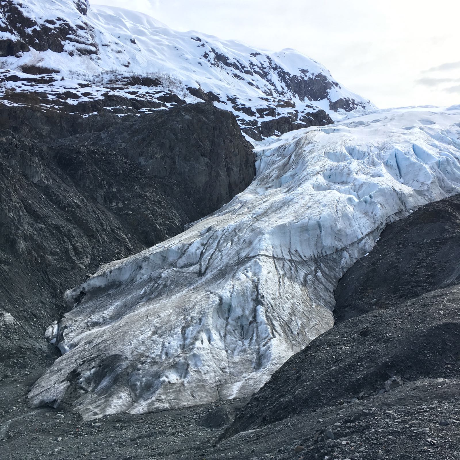 O italiano Fosco (não quer revelar o apelido) é o cicerone. Tem pouco mais de 50 anos e está quase a regressar a S. Francisco, onde vive, depois de seis meses a fazer consultoria para um dos serviços federais em Anchorage. Esse tempo deu-lhe para saber alguns segredos da cidade e do modo de ser alasquiano. “São afáveis, mas um pouco loucos”, conclui. O encontro com Fosco foi casual, a alguns quilómetros dali, quando interrompeu o silêncio da montanha: “Vai subir?”, perguntou nessa tarde no sopé do Glaciar Exit, no Parque Nacional de Kenai, um dos mais belos e preservados do Alasca. A pergunta de Fosco seria a primeira frase do que se revelaria uma incontinência verbal auto-diagnosticada. Espera resposta enquanto ajeita o gorro e dá a mão a Silvia, a namorada eslovaca, designer de interiores que tirou uns dias para conhecer o Alasca antes de partiram os dois. São quase cinco quilómetros daquele ponto até atingir o glaciar. Não se avista ninguém ao longo do percurso que a partir de certa altura se faz por um carreiro estreito de chão cada vez mais negro e árido. Há fezes de animais selvagens e outra vez os avisos: nada de atitudes histéricas se ficar frente a um.
