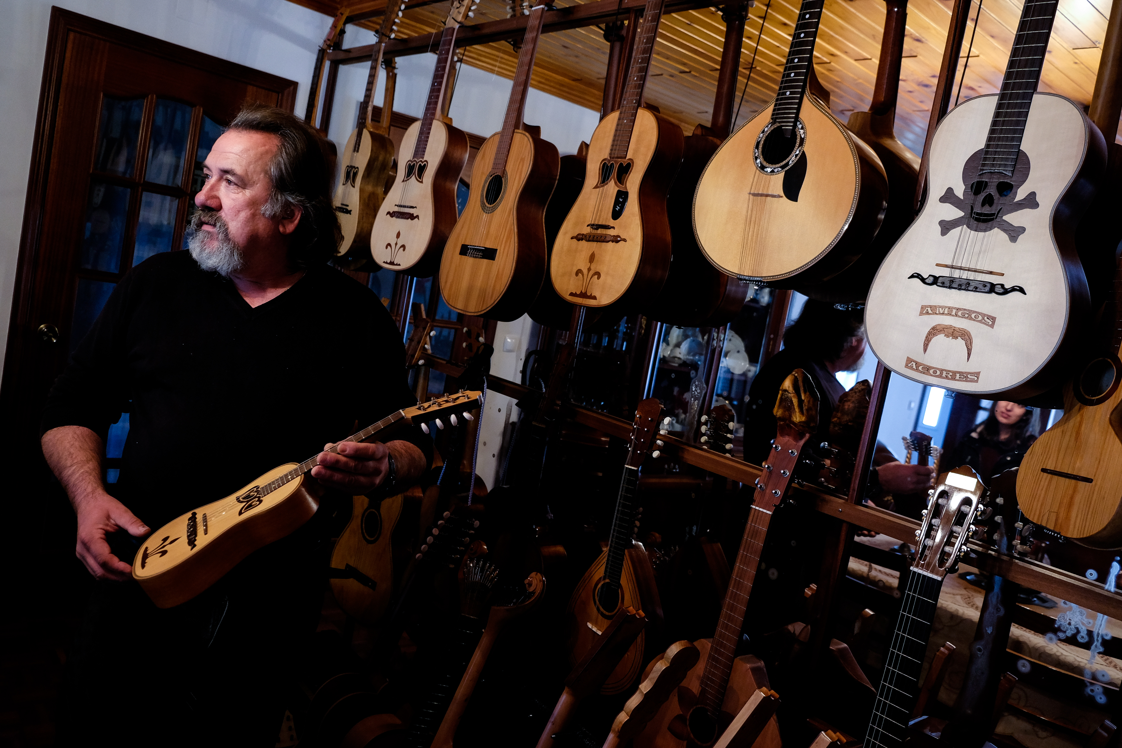 Estamos em Santa Cruz da Graciosa, na casa de Serafim Silva, 55 anos, um dos poucos construtores de violas na ilha açoriana. Lá ao fundo, na parede espelhada da sala de estar, estão filas e filas de violões, violas da terra, cavaquinhos e guitarras de mil feitios. Vai pegando num e noutro instrumento, dedilhando-lhes cada história.
