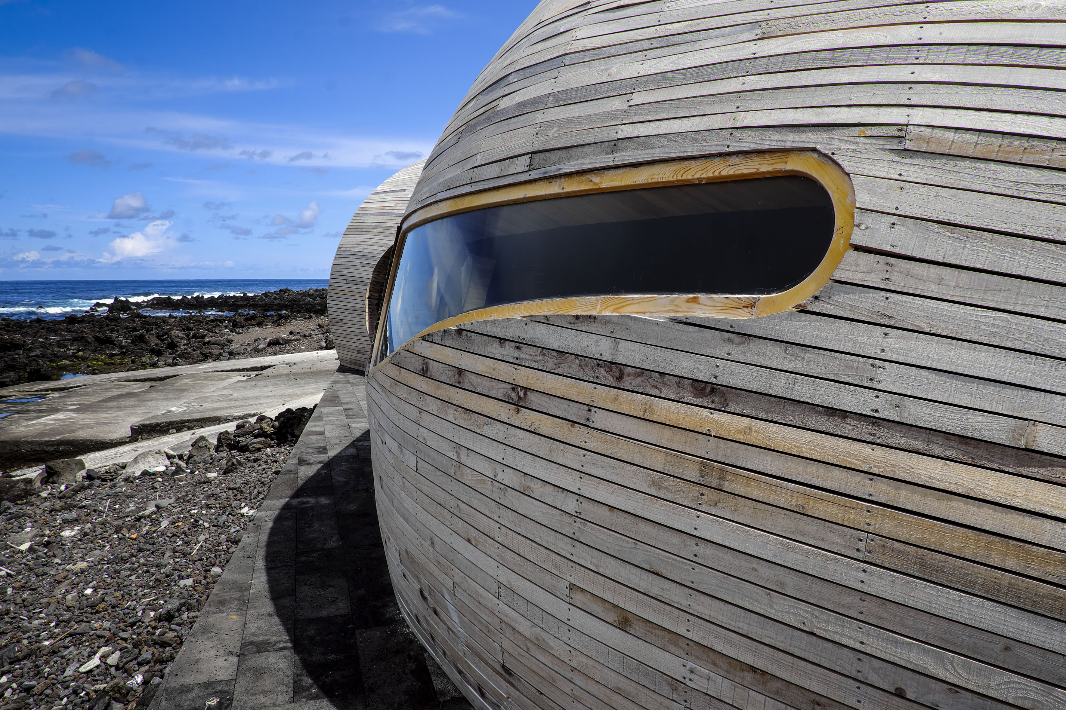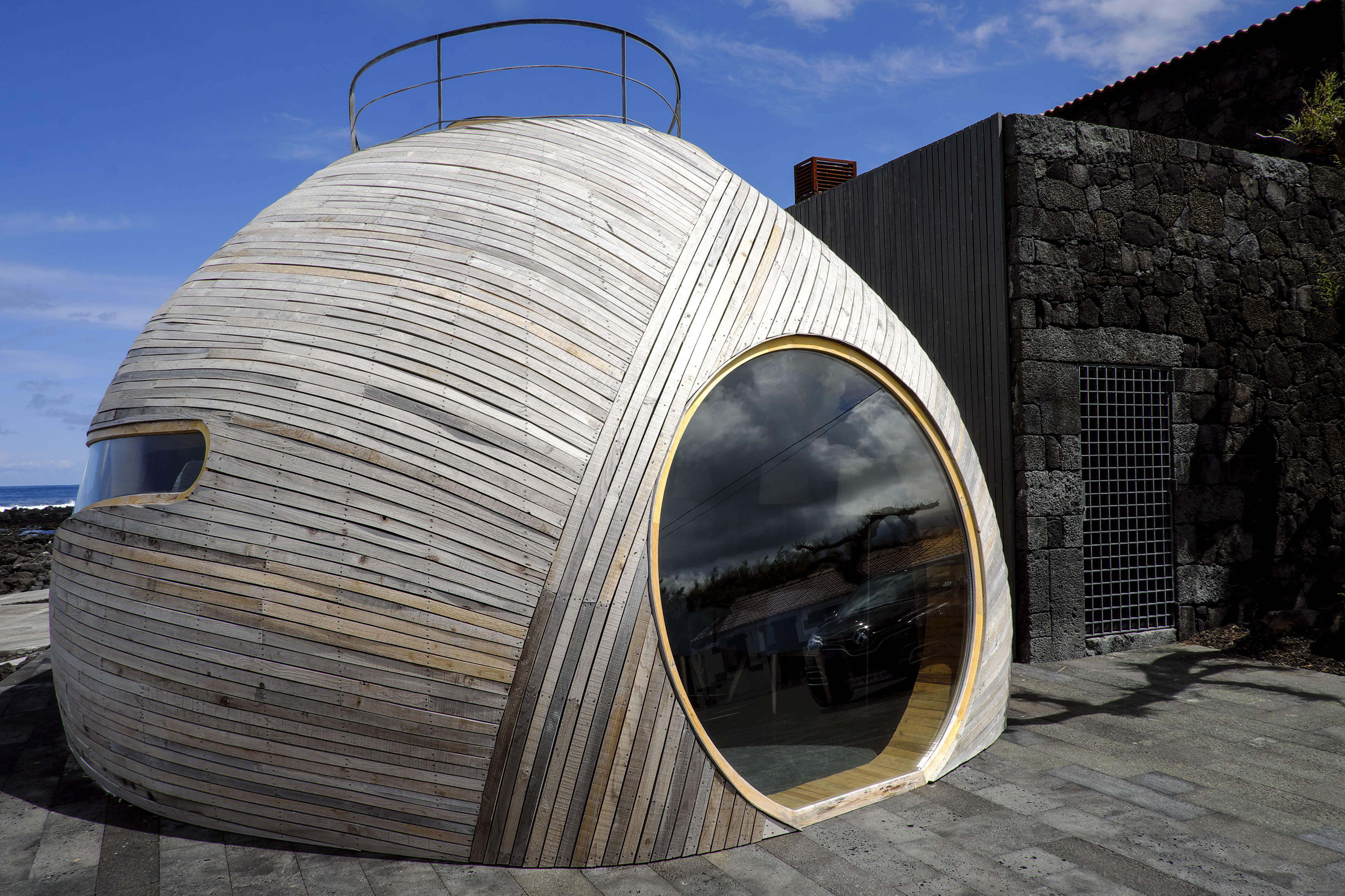 Despertamos do devaneio, ligamo-nos de novo ao mundo, viramo-nos para trás e damos de caras com um barco encalhado em terra. Ou será antes uma baleia? Uma pipa de vinho, quem sabe? Um vulcão? Uma pedra que caiu do céu, um óvni? Ou um pouco disto tudo? Houve aqui uma intenção, é claro — “várias características do ambiente estão presentes na arquitectura do edifício (…) [que] actua como uma escultura gigante, feita sob medida para a sua localização”, lê-se na descrição do projecto —, mas o Cella Bar muda de figura dependendo dos olhos que olham para ele. O que não muda é a estupefacção (ou será encantamento?) quando se percebe que as fotografias também pecam por defeito.