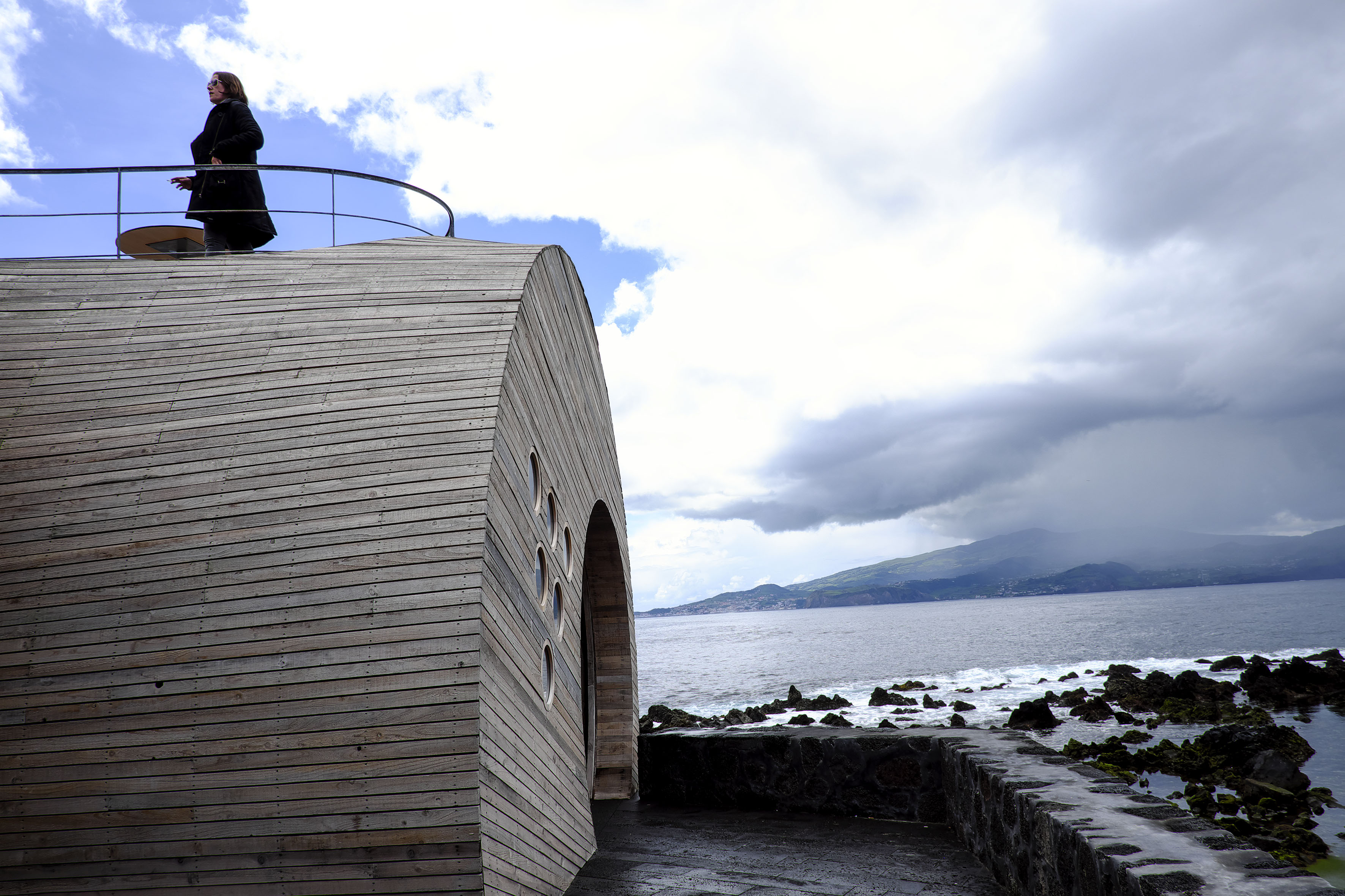 Antes de subirmos, porém, viramos à esquerda e de novo abrimos a boca de espanto. A sala do bar propriamente dito é rasgada por janelas ondulantes que trazem para dentro o assombro paisagístico de que há pouco falávamos. É como se estivéssemos a espreitar o mundo pela escotilha de um barco — e esse, visto daqui, é o mesmo mundo de mar turquesa aqui e azul-petróleo ali, do Faial lá na frente, das rochas negras que se espalham sem regra, da dança das gaivotas, do mesmo sol tímido de Abril, só os pingos de chuva é que já não caem.