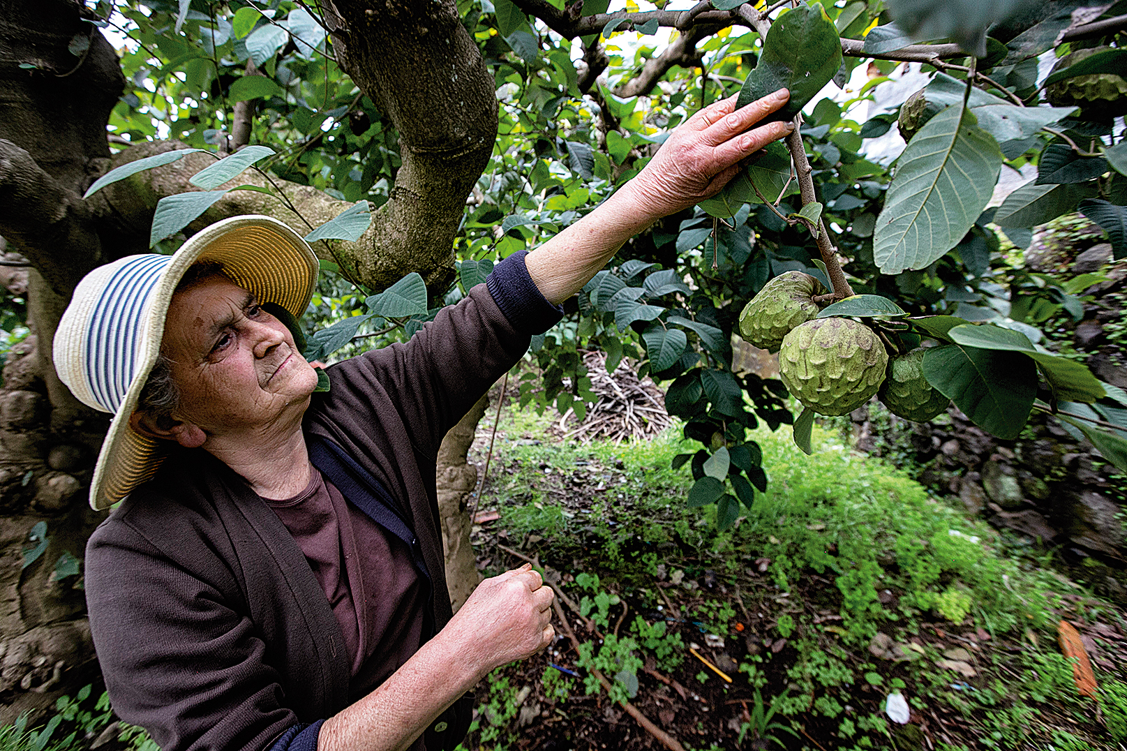Fomos então atrás das anonas, mas, tal como aconteceu com o maracujá, o nosso produtor, Jordan Andrade, já não tinha anonas nas árvores (tem um hectare com anonas e 300 metros quadrados de abacateiros, tudo biológico). A dificuldade acabou por ser ultrapassada quando nos levou ao terreno de uma vizinha, a senhora Maria, no Machico, cujas magníficas anoneiras e abacateiros estavam ainda em produção.