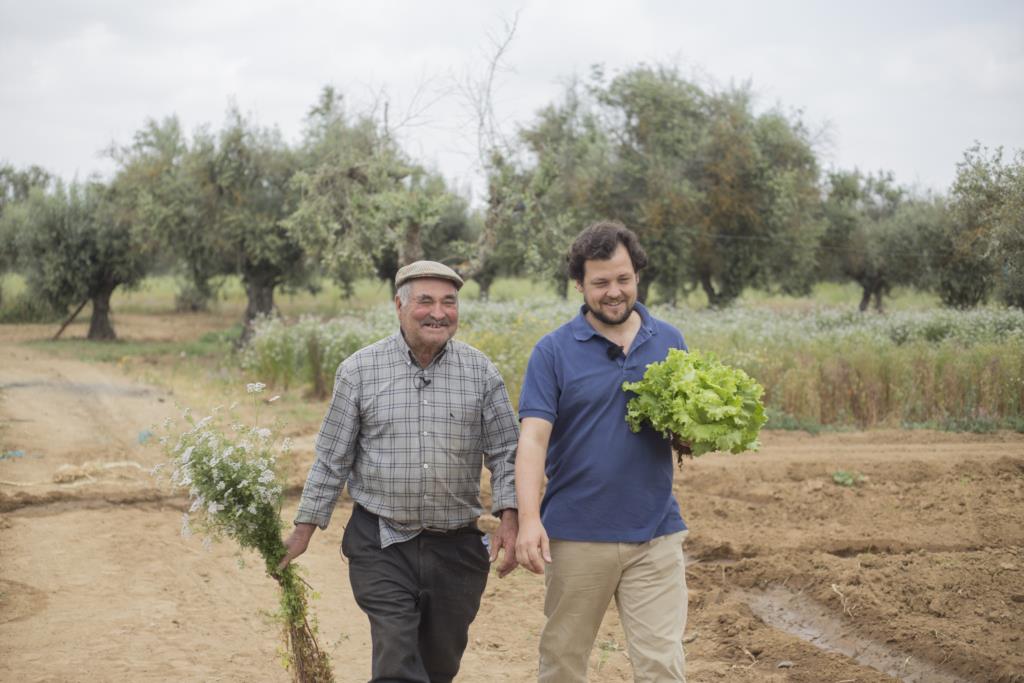 Estando no Alentejo, além do porco preto que é um produto autóctone da região, o chef procurou que o segundo componente, a alface, também fosse dali. Assim, fomos até à horta do Sr. Domingos, em Reguengos de Monsaraz, buscar algumas alfaces para a confecção.