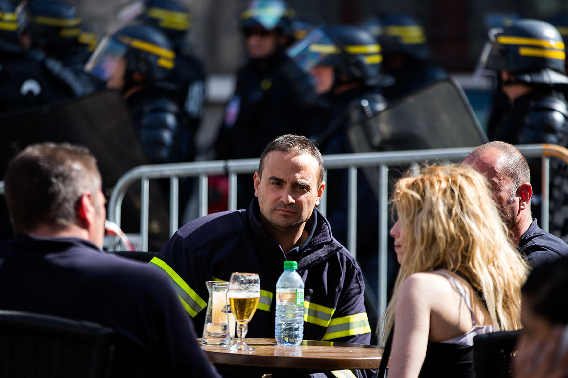 Toda a gente na esplanada a ver a manifestação e só um pouco de comoção quando há o embate, que passa logo. Mais uma hora de petardos a estourar, e já parte da manifestação está na esplanada a beber uma cerveja.