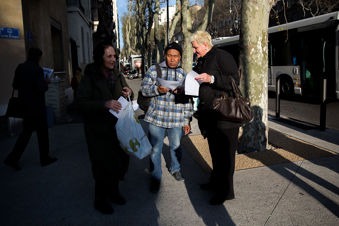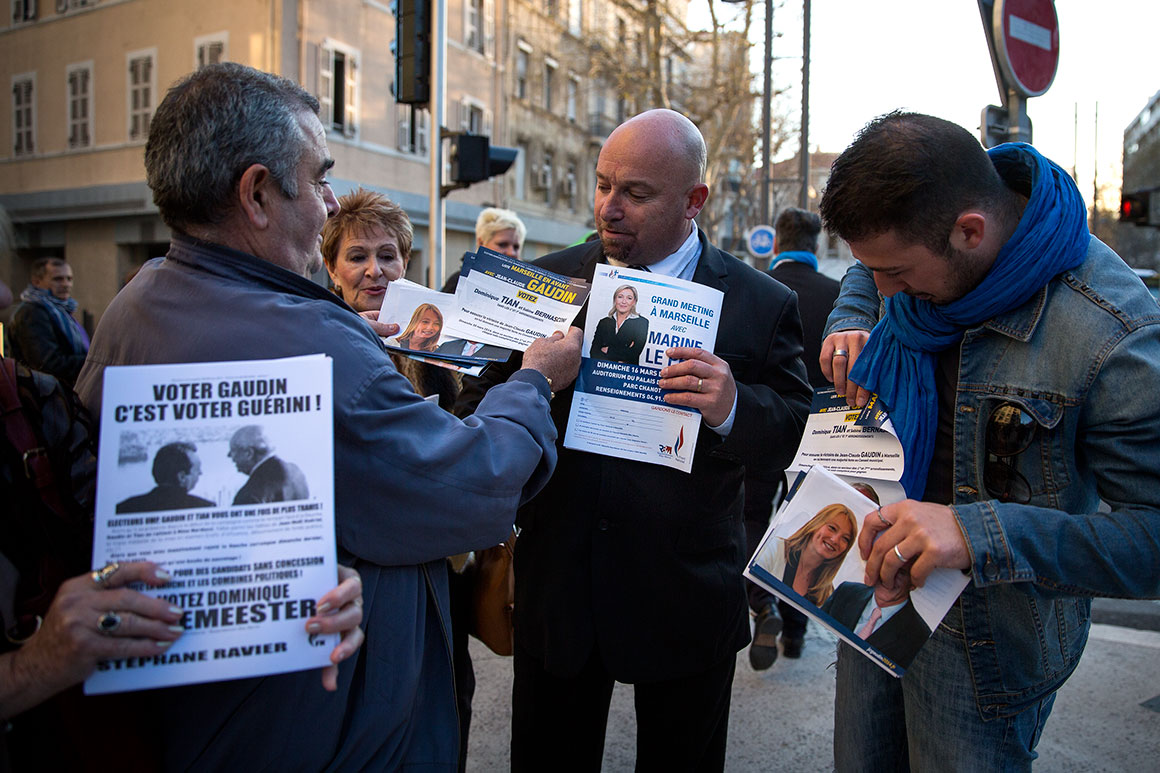 Em Marselha, a UMP (União para um Movimento Popular, na oposição a nível nacional) ficou em primeiro, logo seguida da Frente Nacional. Negociou com o Partido Socialista, em terceiro, uma lista. Hoje, dois grupos, um da Frente Nacional e outro da UMP, fazem campanha na praça 4 de Septembre.