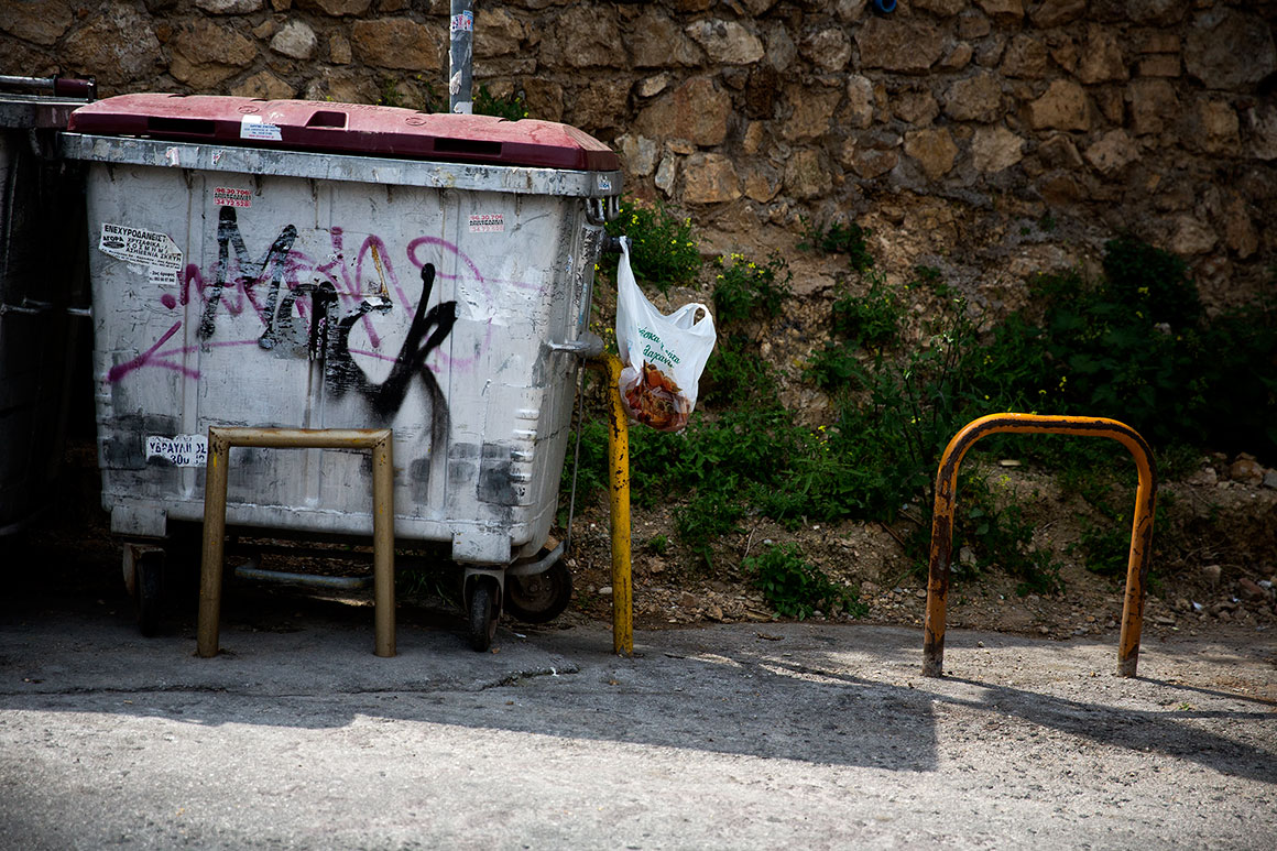 E depois há pormenores. Ver pessoas a procurar no lixo é comum. O que se tornou novo em Atenas é que as pessoas passaram a não deitar comida fora directamente no lixo. Deixam-na em sacos de plástico pendurados na tampa dos contentores. Muitas vezes são sacos com pão. Desta vez, era um frango.