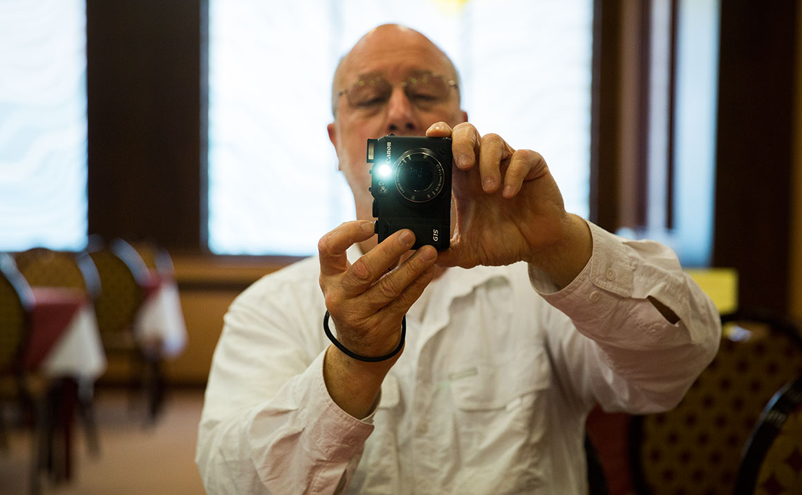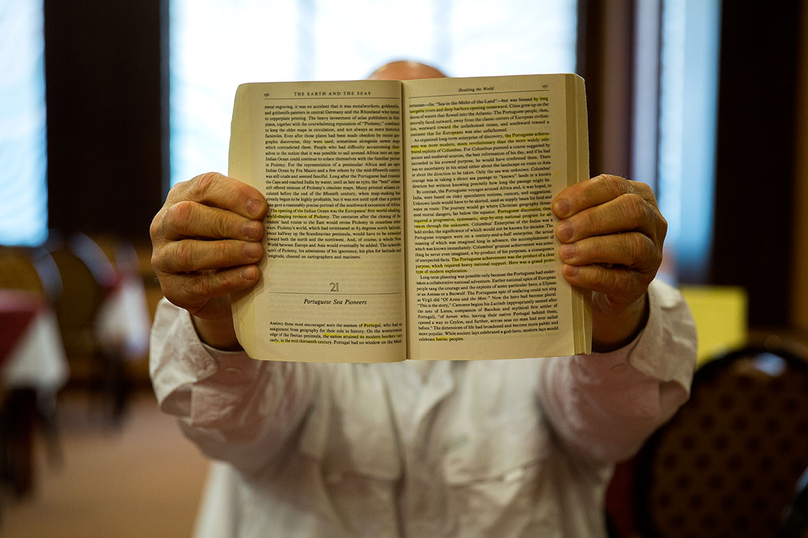Herb Teachey tem um livro sobre os Descobrimentos que lê atentamente e logo foi partilhar a mesa do pequeno-almoço no hotel em Budapeste com uma portuguesa.