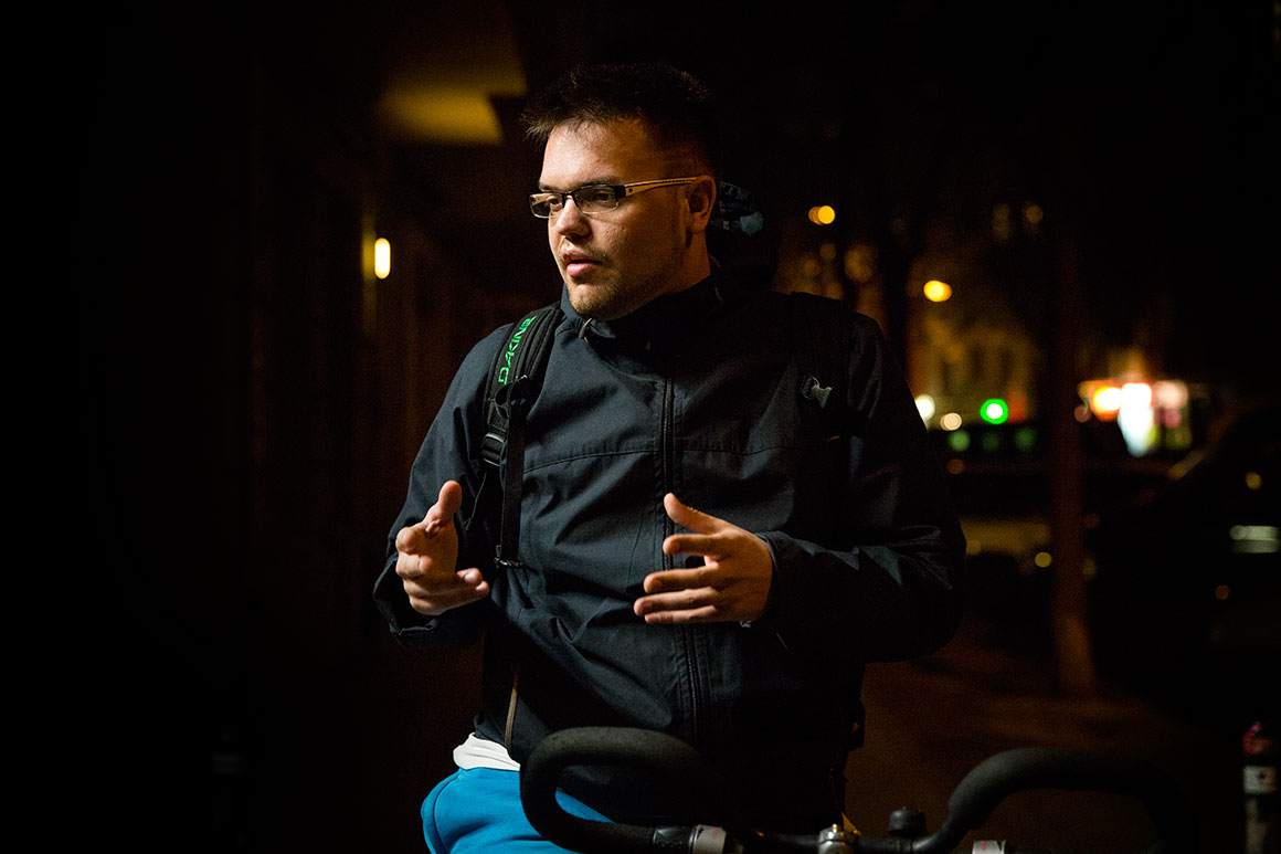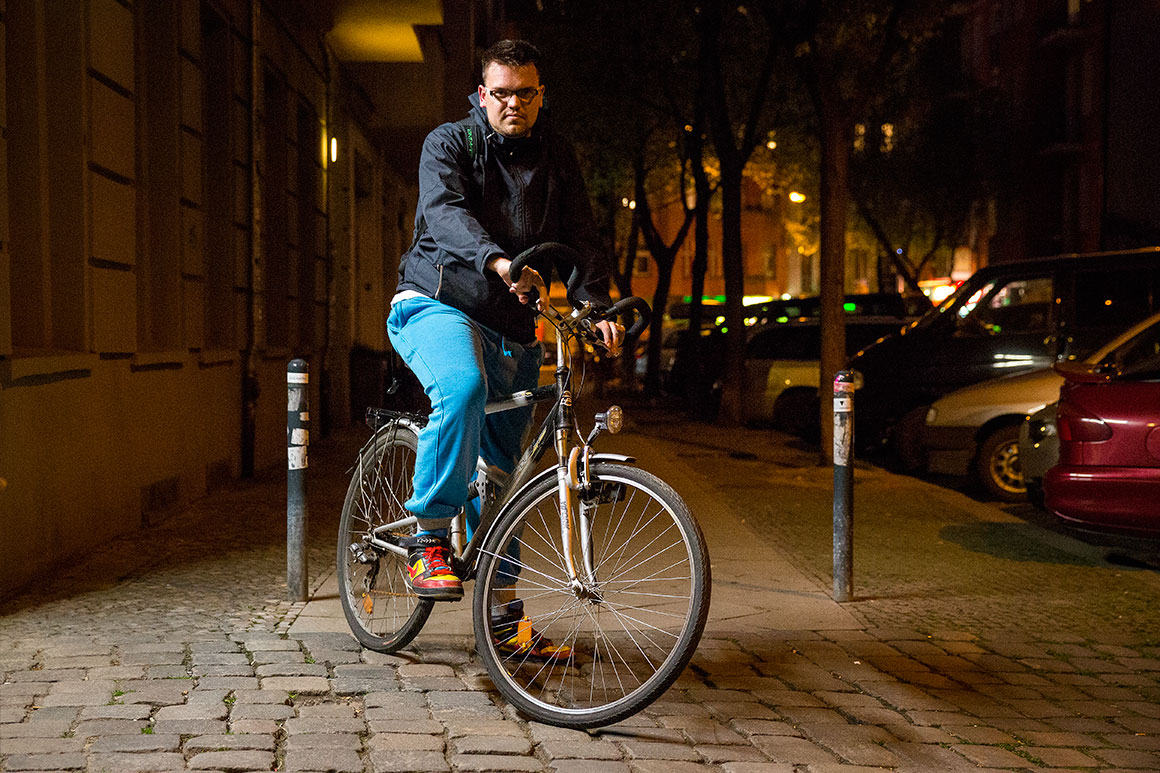 Photon (o nome real é Marcus Hinze) distribui pequenos quadrados de papel com o logo do YouTube e o título do seu novo single numa rua de Friedrichshain, em Berlim.