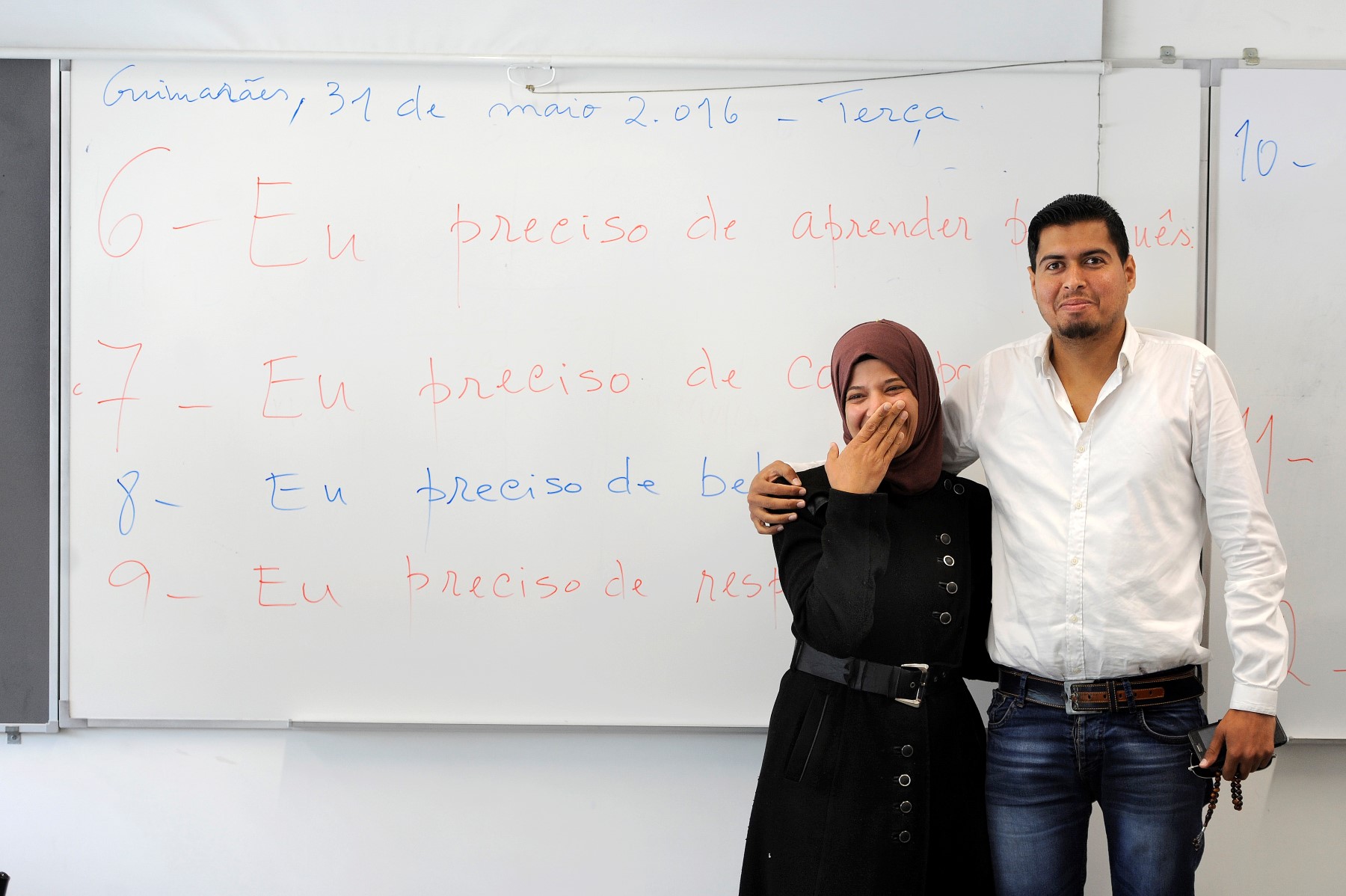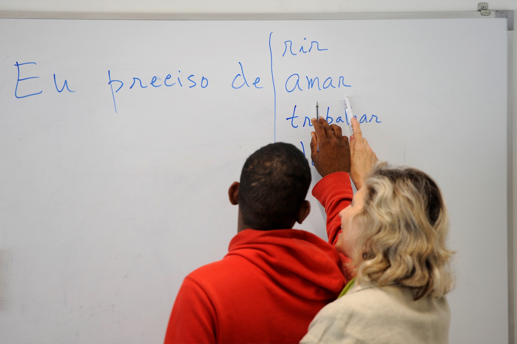 Adélia Pires Gamboa, 61 anos, foi uma das professoras voluntárias para ensinar português aos refugiados e é isso mesmo que faz, três vezes por semana, durante duas horas, na Escola Secundária Francisco de Holanda. Adélia não tinha tido ainda a experiência de ensinar a refugiados uma nova língua e, além de seguir a metodologia da profissão, muitas vezes deixa que sejam as necessidades dos refugiados ou as suas emoções a ditar o rumo da aula. Neste momento, está particularmente preocupada com Goitom, um eritreu que deixou a companheira, grávida, em Itália. “Eu a dar a aula tenho em consideração as emoções deles — não precisamos só de comida, precisamos de amor, de afecto, de um abraço. Eu às vezes choro com eles”, diz Adélia, num estilo muito afectuoso que parece conquistar os refugiados, que riem à gargalhada e aproveitam as aulas para desabafar com ela e procurar soluções para o que os preocupa.
