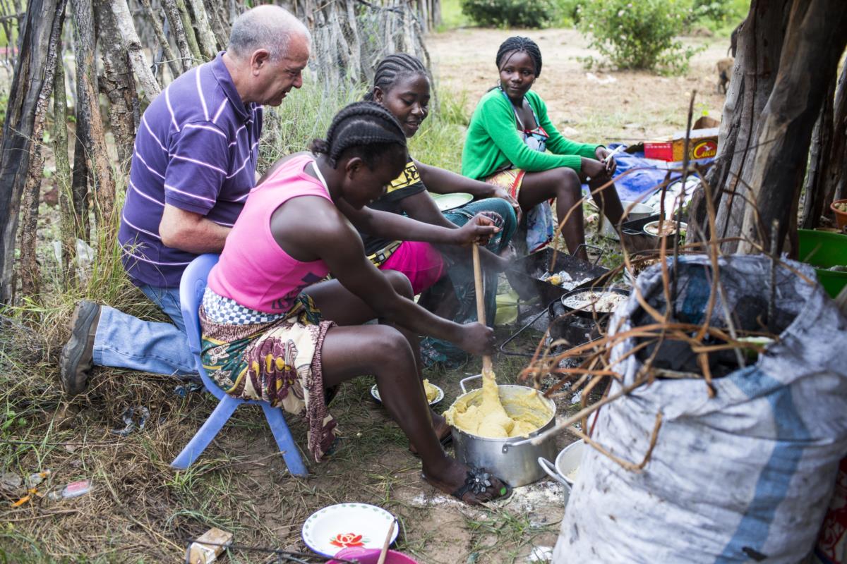 Enquanto o pai cozinha uma carne à jardineira, Jorge anota silenciosamente numa pequena folha de linhas a receita do prato em seis passos — "cebola, tomate, alho, pimento, cenoura, carne". António vai dizendo o que faltaria, "lá em Portugal meto louro, azeite português e ervilhas". Serafina é uma das meninas que foram trazidas para a festa para cozinhar, está a descascar batatas e a olhar espantada para António, "o avô está trabalhando".