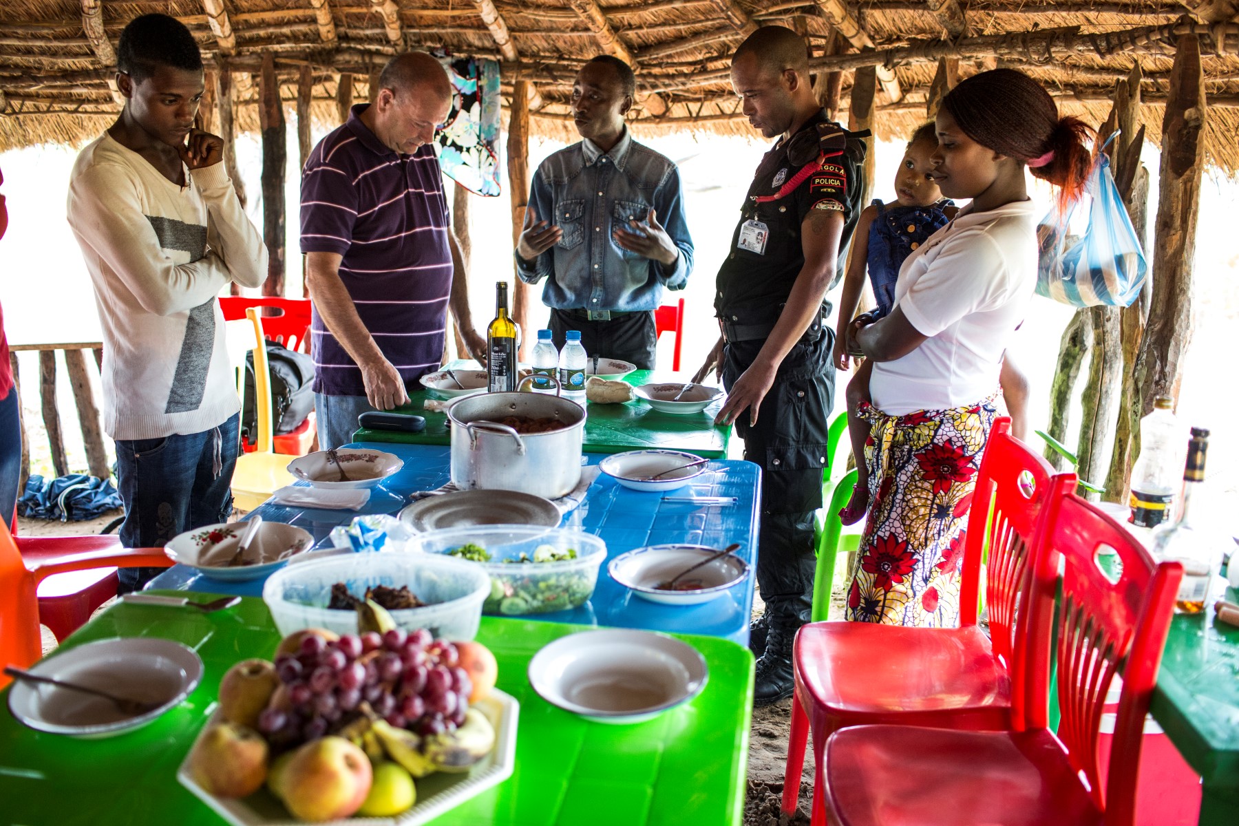 O público, de tão numeroso, abafa o ambiente quando entram todos para a pequena casa da família, produzindo ainda mais calor do que aquele que já está. Sentam-se num dos três sofás de padrão tigre com um pano a protegê-los, em frente a uma televisão de plasma que funciona quando o gerador é ligado, mas é como se estivessem no exterior porque o pano verde-claro com flores cor de vinho que faz de porta da rua foi corrido para o lado. A única janela da sala está preenchida por rostos de várias idades que se colocaram numa plateia informal espontaneamente organizada por alturas, para dar lugar a todos poderem assistir.