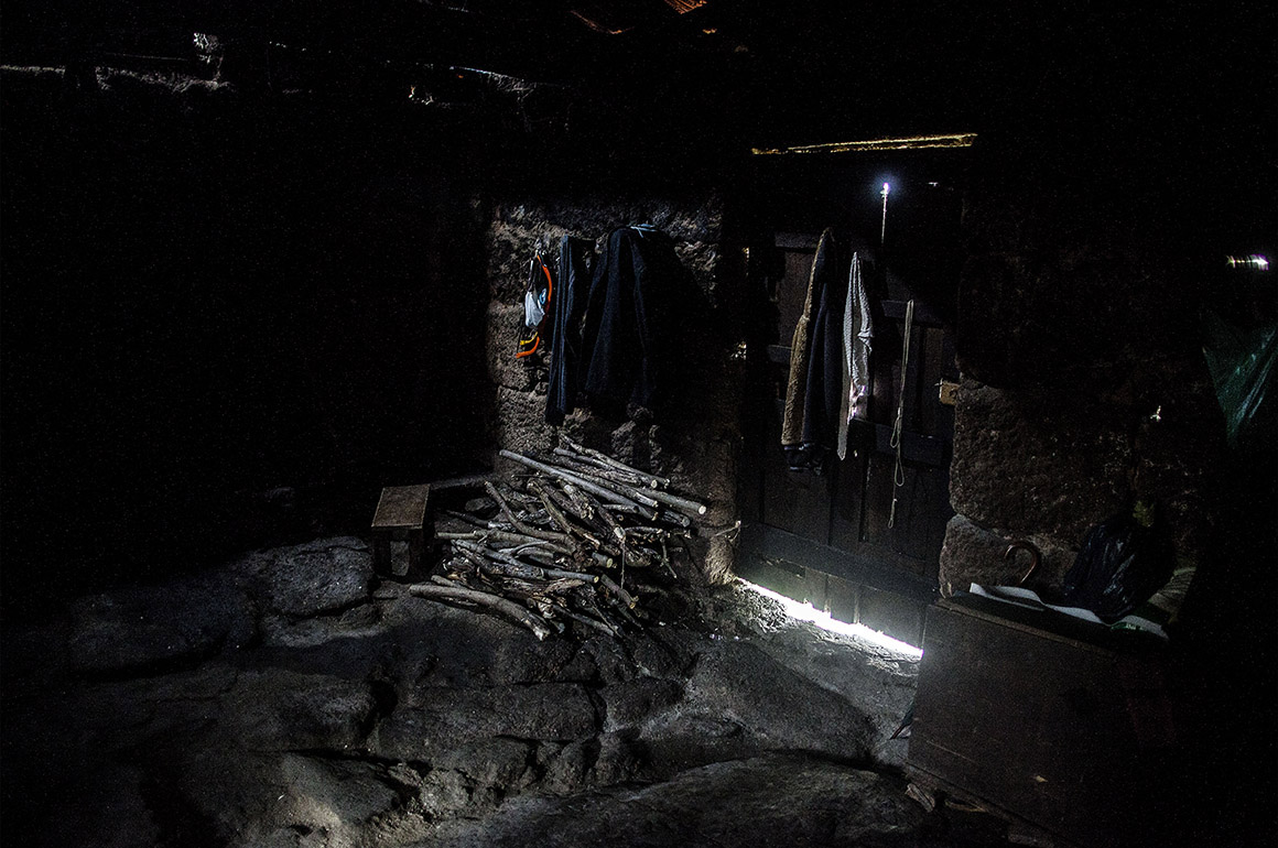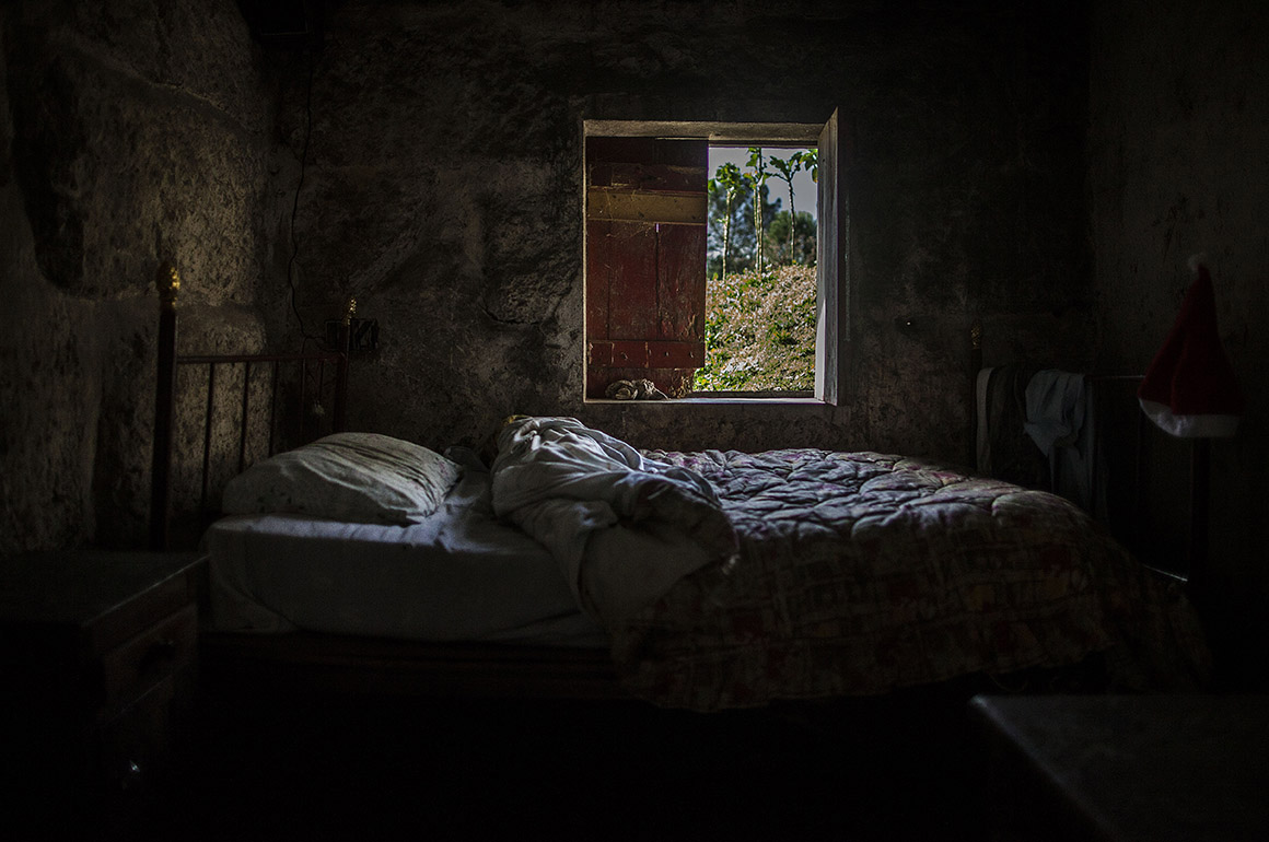 Não é que o tempo tenha parado, como para aí se dirá. É que a natureza ainda marca o tempo nesta casa gélida, sombria. Levantam-se com o Sol e com ele se deitam, Olga numa cama, António na outra. “A gente não vai estar a fazer serão”, diz ela. “Não vale a pena a gente estar ao frio.” Sobram brechas no telhado, nas portas, nas janelas. “Faço o jantar cedo. De Inverno, às vezes, deixo [comida] do meio-dia para a noite. De Verão não, que é muito calor, a gente não tem frigorífico, estraga-se tudo.”